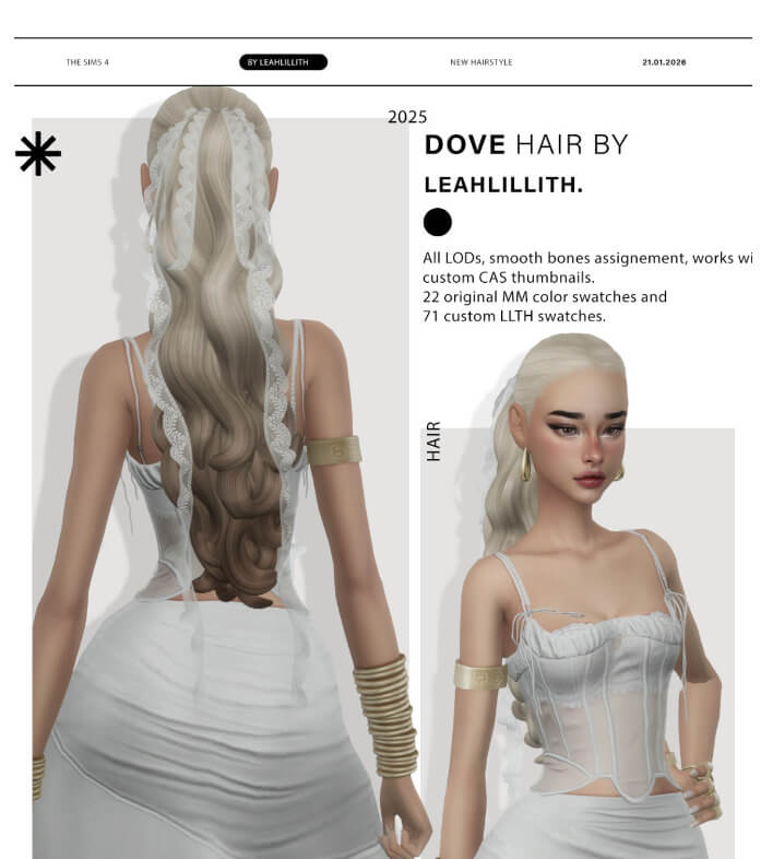 Dove Hairstyle: DOWNLOAD I have been seeing those amazing hairstyles with long long ribbons all over the internet so naturally I had to make one. The hairstyle has: 2 pallettes MM and LLTH 3 optional recolors that can be found in FACE PAINT section, both in MM and LLTH pallettes Ribbon accessory that can be found in HATS Hope you will love it <3