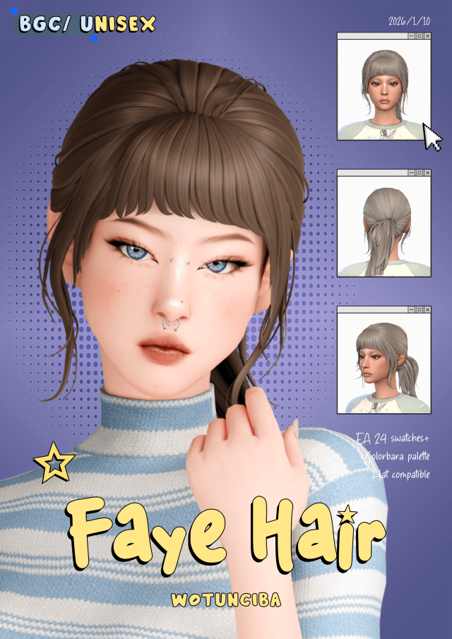 Faye Hair I originally planned to base this hair on a bg ponytail… somehow it ended up being a 100% new mesh again oops. Because of the bangs, from a distance it might look a little like a pot lid sitting on her head T-T but I still really like how it turned out- hopefully you’ll like it too 🫶 BGC / Unisex / Hat compatible CAS filters tag added √ Extra colors available with the Colorbara palette add-on (41 swatches. You’ll need to have the Faye hair.package installed first for the Colorbara add-on to show up. Once you have both in your mods folder, the 39 extra swatches will appear right after EA’s 24 base ones!)