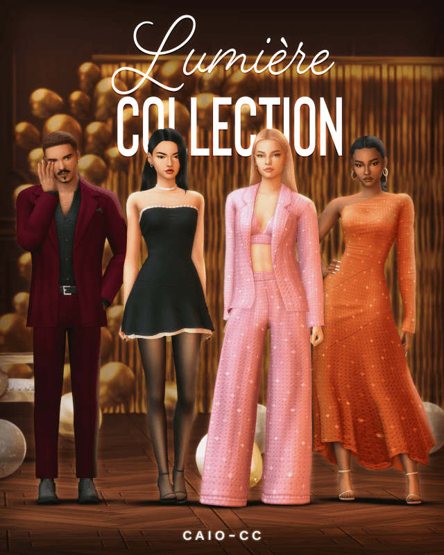 Lumière Collection Hey Simmer! ✨ Celebrate the festive nights with Lumière, a curated set of 9 pieces crafted with velvet textures and glitter accents. Every item was made to bring elegance and shimmer to your most special gatherings. From refined shapes to sparkling finishes, this collection was created to light up every celebration. BG Compatible T-E Male & Female Custom Tumbnails 18 colors Glitter Palette