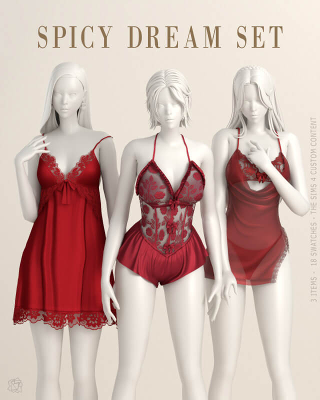 Spicy Dream Set – Bluerosesims New meshes (3) 18 swatches (available color slider mod) Custom Thumbnail All maps Compatible with Base Game and HQ