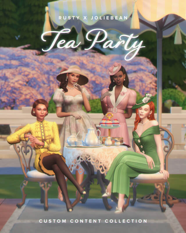 Tea Party Collection by Joliebean and Rusty 🌹 Rusty and I joined our forces to bring you timeless elegance of tea garden gatherings with our new Tea Party Collection. Inspired by lavish tea parties and aristocratic fashion, this CAS set features 26 items to complete your Sims’ sophisticated looks. Enjoy and happy simming!