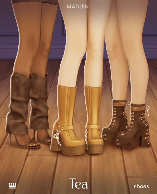 Tea Shoe Set If your simmies love a chunky heel and a bold statement, this release is made for them. I wanted to give you a mix of edgy, nostalgic styles that can instantly elevate any outfit or complete a full streetwear look. This set features three styles: The Slouchy Open-Toe Boot: A killer stiletto heel paired with a relaxed, slouchy shaft and a strappy open-toe design. The Chain Platform Boot: A mid-calf, mega-chunky platform boot featuring a thick ankle strap and a bold hardware chain. The Lace-Up Platform: A rugged but stylish ankle boot with heavy lacing details, thick stitching, and a massive platform heel for ultimate grunge vibes.